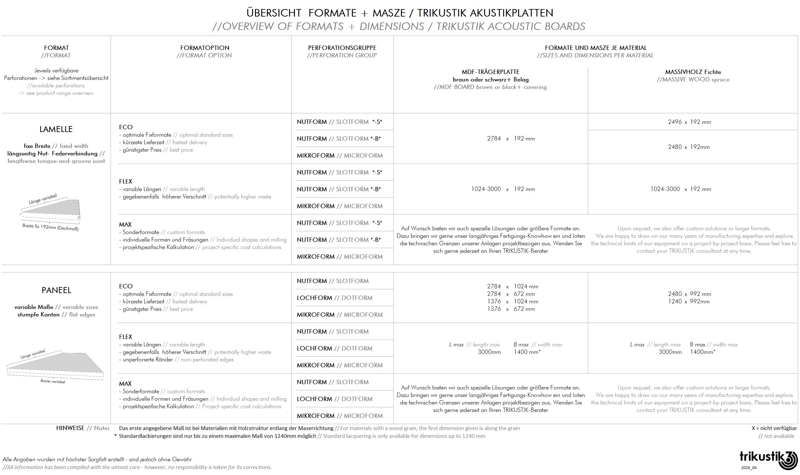 - Angaben zu Formaten je Material für Ihre Planung finden Sie in der nebenstehenden Übersicht